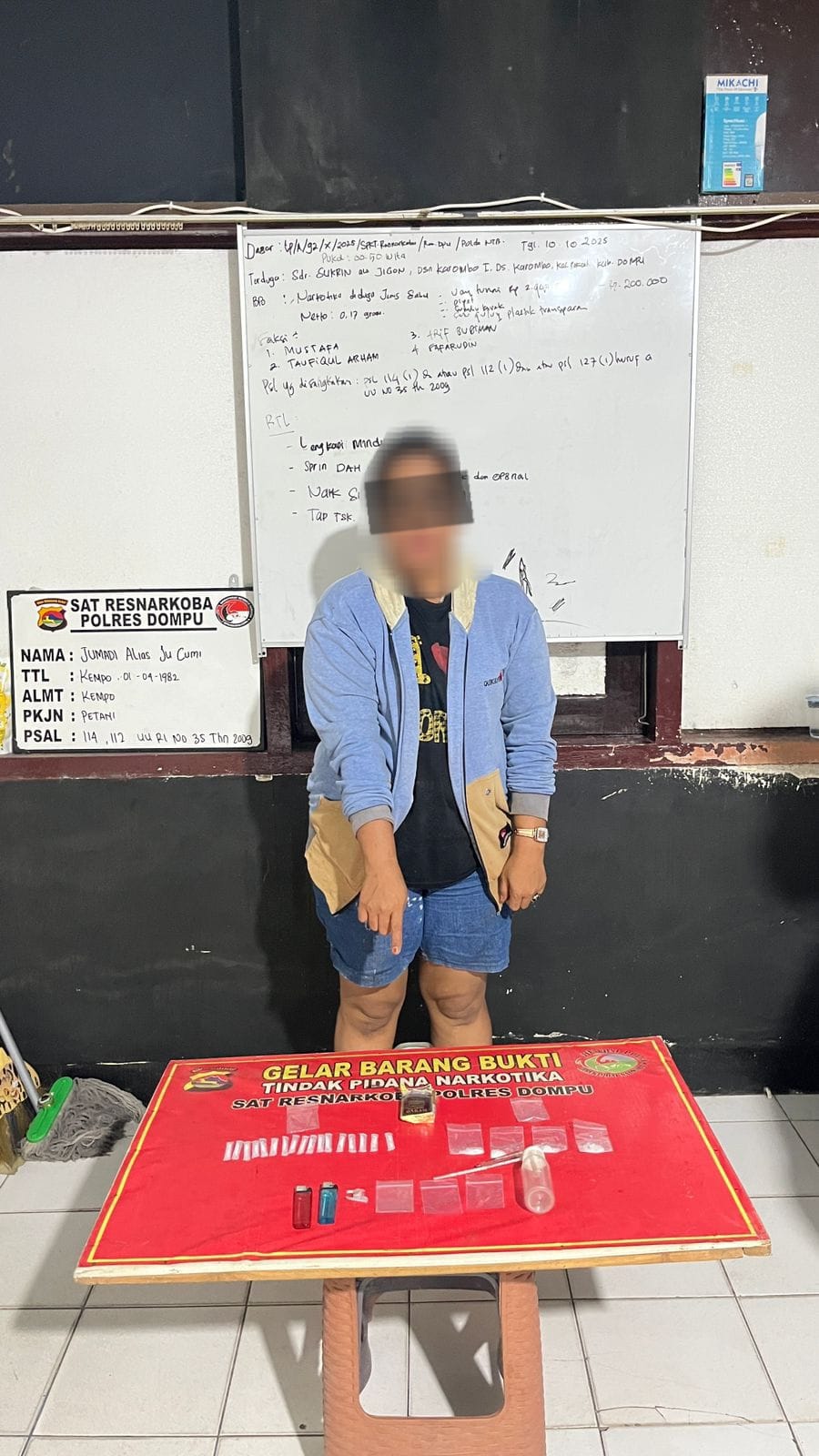 Terduga pelaku diketahui berinisial R (33 tahun), warga Lingkungan Kandai I, Kelurahan Kandai I, Kecamatan Dompu. Dari tangan pelaku, polisi berhasil mengamankan sejumlah barang bukti narkotika jenis sabu dengan berat bruto 7,38 gram dan berat netto 2,04 gram, beserta alat hisap (bong), korek api, dan plastik klip kosong.