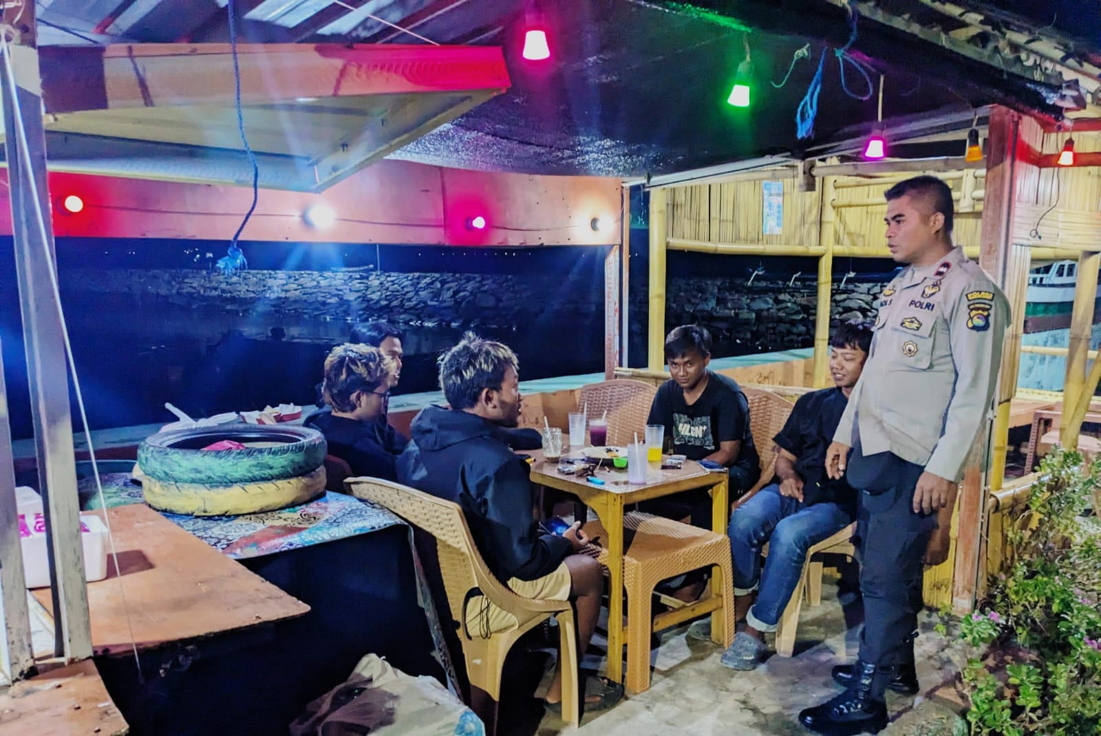 Patroli tersebut menyasar sejumlah titik di wilayah hukum Polsek Poto Tano, salah satunya di kawasan warung pinggir pantai yang kerap menjadi tempat berkumpulnya masyarakat pada malam hari.