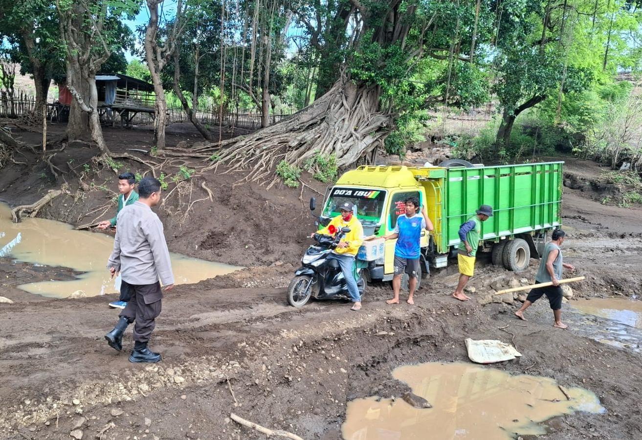Di Tengah Lumpur, Polsek Soromandi Lakukan Pengaturan Arus Lalulintas dan Bantu Para Pengendara Sembarangi Jembatan