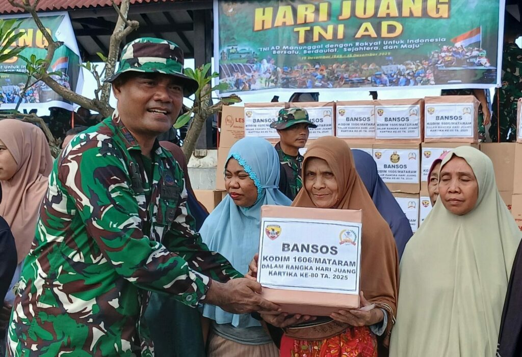 Mataram, NTB – Kepedulian terhadap masyarakat kecil kembali diwujudkan Komando Distrik Militer (Kodim) 1606/Mataram melalui penyerahan bantuan sosial kepada 200 warga kurang mampu di Taman Loang Baloq, Tanjung Karang, Sekarbela, Kota Mataram, khususnya mereka yang berprofesi sebagai tukang sapu jalanan dan tukang parkir. Kegiatan ini dilaksanakan sebagai bagian dari rangkaian memperingati Hari Juang TNI AD sekaligus bentuk pengabdian nyata TNI kepada masyarakat sekitar, Rabu (10/12/2025).