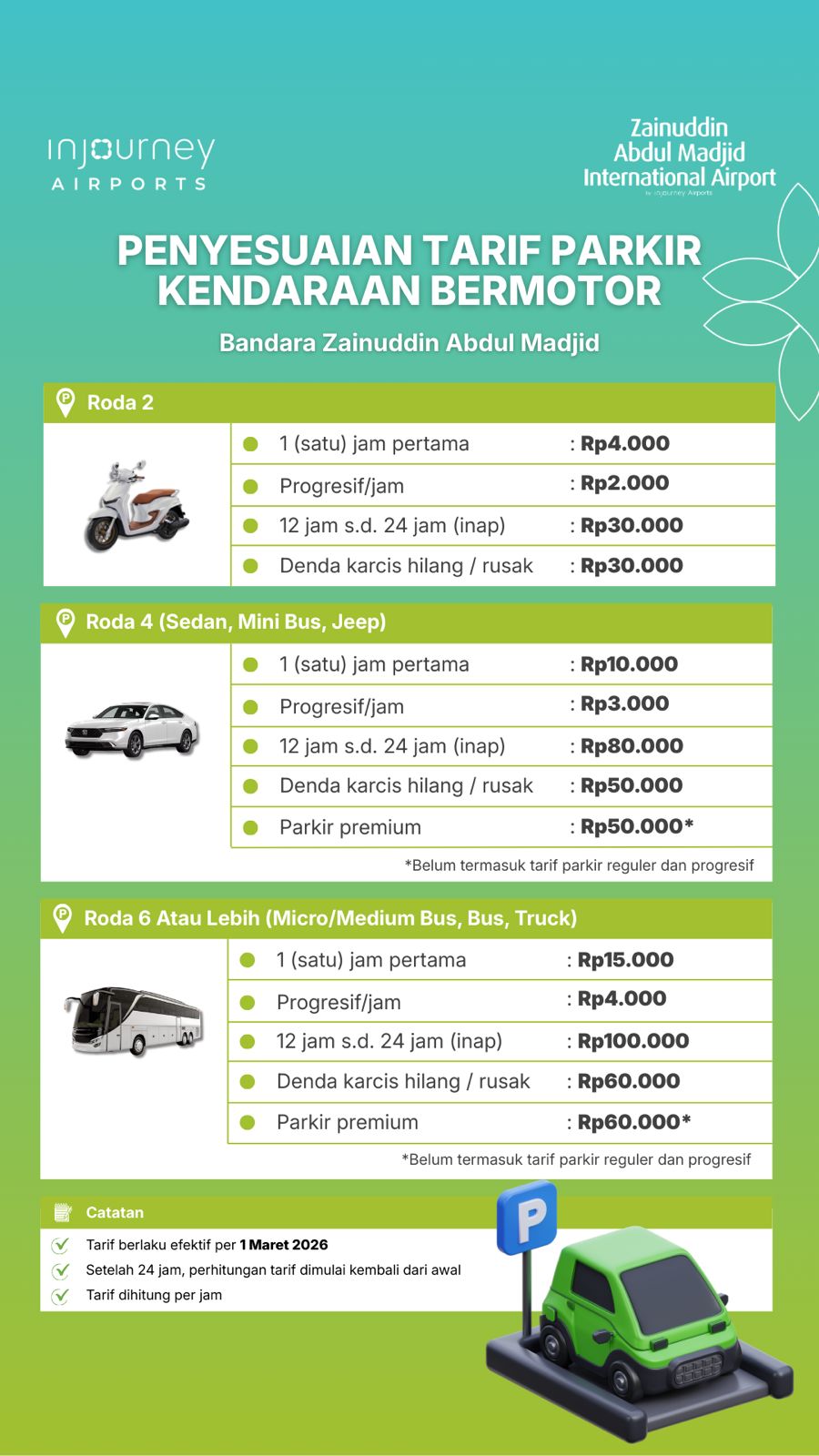 “Tarif parkir di Bandara Internasional Zainuddin Abdul Madjid belum mengalami penyesuaian sejak tahun 2021. Penyesuaian tarif ini tentunya telah didahului dengan peningkatan fasilitas dan pelayanan parkir yang kami sediakan bagi pengguna jasa bandara,” ujar Aidhil dalam keterangan tertulis yang diterima, Sabtu (28/2/2026).